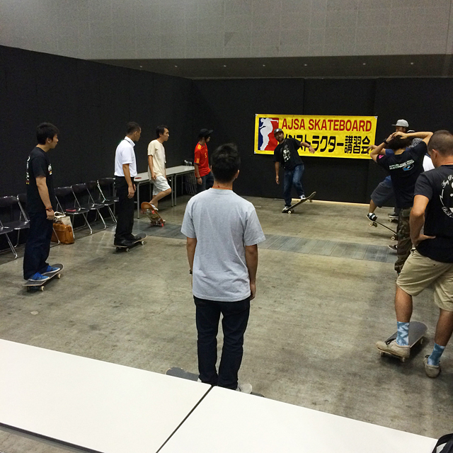 で、インタースタイル初日の午前中は恒例のAJSAインストラクター講習会であります。僕も数年前に赤熊プロと一緒に受講して証書もらいました。毎回5050のカレーちゃんの講習を真剣に聞き、地元のシーンにフィードバックしようとしている方がいっぱい参加しております。ちょっと見てたら一人でスーツと革靴の人が居る。「最近はそんな感じなのかー」って思って良く見たら、なんと仕事を抜け出して参加してた千葉のスケートシーンの重鎮 武村幸太郎でありました。久々に会えてうれしかったわ。今でも滑ったら絶対ヤバイと思うよ。スムーススタイルでキレイなライディングなんすよ。おじさんスケートボーダーは気軽に復活しましょう。足腰痛めてスケートボードから離れた人もそろそろプッシュからどうですか?最近はパークやスポットも増えてかなり環境も変わってますからかなりハードルは低くなってます。昔のように最先端を追いかける必要もないしさ。ただプッシュして流すだけでも相当スケートボードは楽しいす。復活のセッティングはショップでいつでも相談に乗りますのでお気軽にご相談ください。