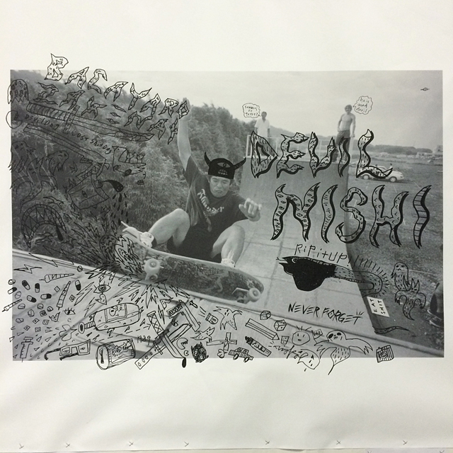 DEVILDOG×diskahの作品を観てきました。素敵でした。色々な思い出がありました。ジェシーや野坂くんとのコラボも予定されてましたがライブペイントの時間に合わず。完成作品はぜひ観たいす。僕は蓮沼行ったときに西さんと遭遇し、だいぶカービングコーナーに突っ込まされました。あのコーナーの上にライターオイルをどーっとかけて火をつけて「おら!突っ込んでこい!」って。すげーやったね。あのコーナーのカービングでトラックがかからないと怒るからもう命がけですよ。その前に蓮沼行ったときにタケシがスネカービングして骨見えてたからメンタルもちょっと強くなった感じ。まぐれで一回トラックがかかって「よーし出来るじゃんかよー」って言われたときは実はちょっとうれしかった。当時はフィルムなのでその写真を見たことはなかったのですが、ずっと後になってWARPのデビ西さんのページで使ってもらってグッと来ました。プロライダー達との掛け合いは横でよく見てましたが自分がタイマンして始めてわかったやさしさがありました。その話し以外は文字にはできないエピソードばかりではありますが。心からご冥福をお祈りします。