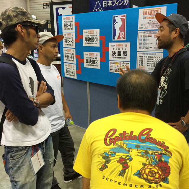 なんてやってたらそろそろAJSAベストトリックコンテストが始まりそう。今回のスタッフはAJSA横山隊長に5050カレーちゃん。DF亀ちゃん、HIBRIDダイちゃんの豪華布陣。チーフの西川先輩もいらしておりまして、このジャッジ陣はブレないす。まったく。軽くレギュレーションの確認をしてエントリー受付スタート。