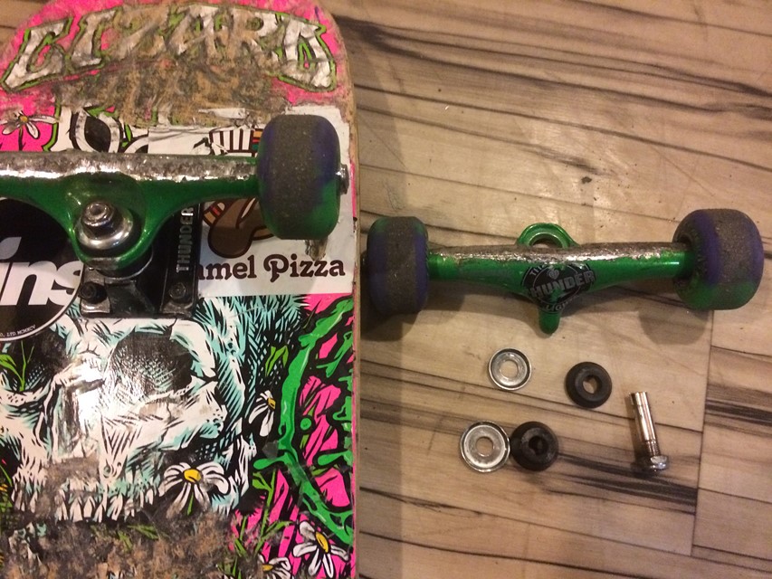 21時頃、そろそろ帰ろうと思っていたら、なんとキングピンがまたしても折れました。デッキは1度も折った事無いんですが、キングピンは今年3本折ってます。笑 3ヶ月に1本ペースで折っているので年内にもう1本折ってしまいそうです。1本目は今年の初めに大学で折ってしまい、そのまま浦安のインスタントに直行し、浅岡さんに15分キングピンと格闘してもらい、見事に抜いて貰いました。笑 2本目は吉祥寺でサトルさんがキングピンと闘い、無事抜く事ができました。今回の3本目はなんとか自分で抜こうと、昨日吉祥寺でトライしたのですが、今回は全くダメで、ハンマーで叩きまくってたらベースプレートがやられました。笑 THUNDERトラックもINDYのようにベースプレートだけ販売してくれないかなーって思いますね。