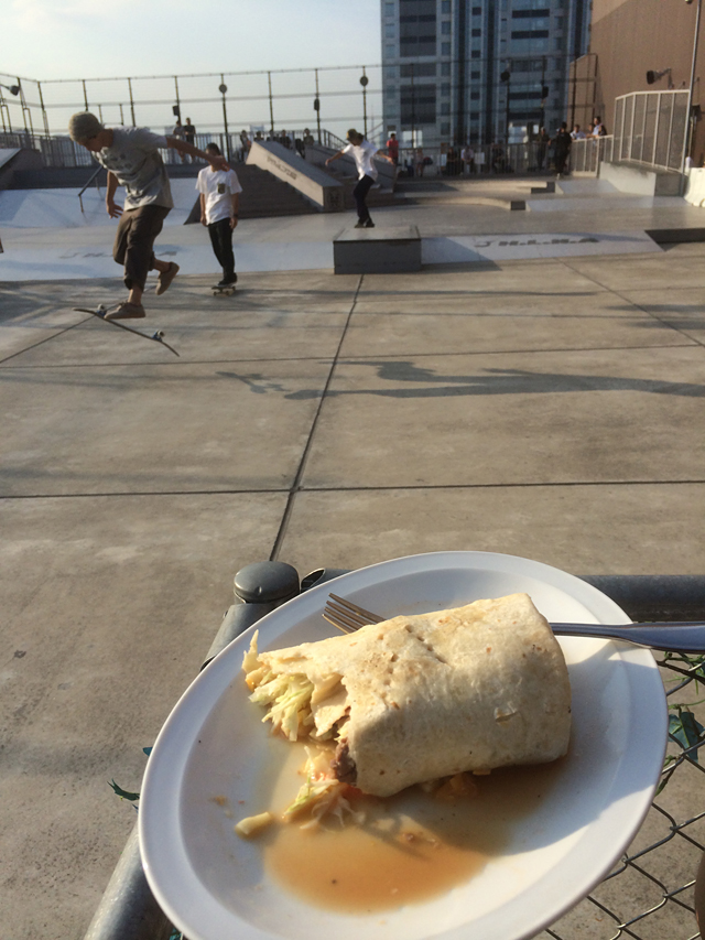 こんばんは、クリです!雨降ってますね~涙 浦安は霧雨のような微妙な雨が降ったり、止んだり中途半端な雨です。これじゃ、今夜は滑れないですね~ 昨日、23日はたまたま休みだったので、HUFのデモに行ってきましたよ!!!自分にとっては初めてのデモだったので、休みだし行けるなら行くしかないと思って、いつも滑る方々と行ってきました!ダイバーシティーに向かう途中で少しスケートしたので、お腹が減ってしまいデモが始まる前に、美味しいブリトーを食べながら、HUFのライダーを待ちました。