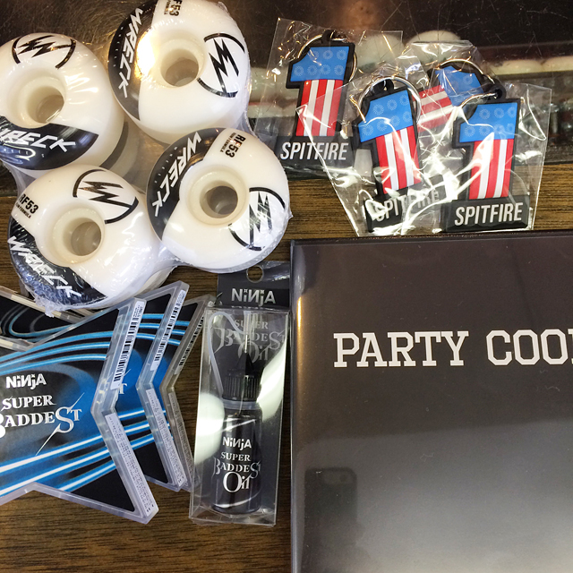 ショップには毎日のように新しいアイテムが到着します。こちらは最新ドメスティックDVDにSPITFIREの最新キーホルダーに、出来たばかりのウィールメーカー「WRECK WHEEL」に日本代表ベアリングのNINJAからリリースされた最新モデルのSUPER BUDDESTであります。この時期は秋冬物の入荷が多く、webストアの更新がパンパンになってしまいwebストアでのご紹介が遅れる場合もありますので、このBLOGやtwitterやfacebookなんかでグッと来る商品画像を見つけたらガンガンお電話くださいね。ショップの営業時間はお電話でのご注文を随時受け付けております。