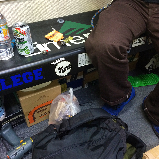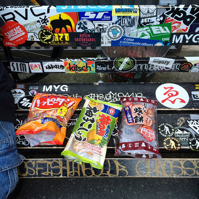 吉祥寺ではシュンペイがお菓子を買って来てくれましたが、そのチョイスの激シブなこと。柿の種の柚子コショウがかなりツボでしたよ。これ美味い。吉祥寺ストアは店頭にベンチがあって、時間帯によっては学生が占拠してカップラーメン食ってたり、また別の時間帯では地元のおじいちゃんが座って煙草吸ってたり、夜には色々なローカルのスケーターが情報交換していたり、とかなりミラクルなベンチであります。ここでいろんな人といろんな話ししました。これからもよろしく。