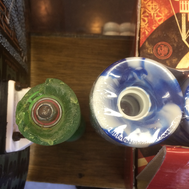 最近は、ちょくちょくいろんなところに滑りに行っております。先週は新横と鉄腕、昨日はDK園。滑り過ぎていた為、今週のミニロトは研究できずにスルーしました。笑 デッキもシューズもボロボロなので、そろそろ交換したいと思います!そうそう、交換といえば、先週、OJの60㎜のウィールを交換しに来たお客様がいたのですが、持ってこられたウィールがスゴイ小さくなったOJだったので思わず写真を撮ってしまいました!汗 吉祥寺の学生のウィールのサイズもビックリですが、こちらのウィールもビックリですね。笑