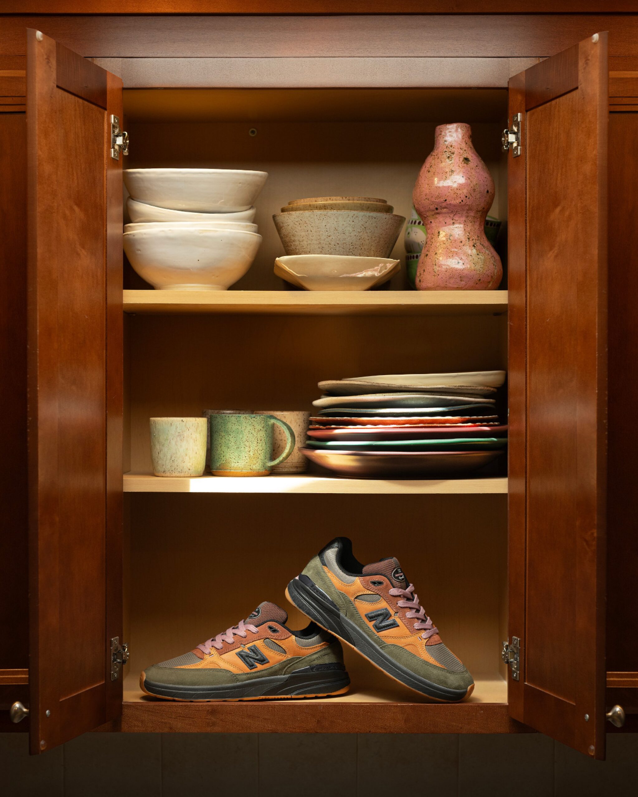 彼のアートワークを想起させる独特のカラーパレットに加え、レザー・スウェード・メッシュを組み合わせたプレミアムなマテリアル使いで、特別なムードを纏った一足へと仕上げています。