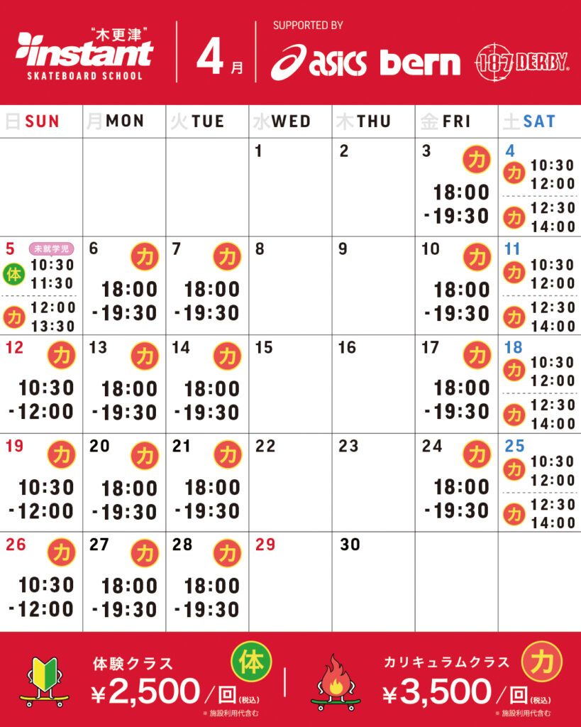 4月の渋谷宮下・千葉みなと・木更津スクールの詳しいスケジュール・ご予約の手順は、