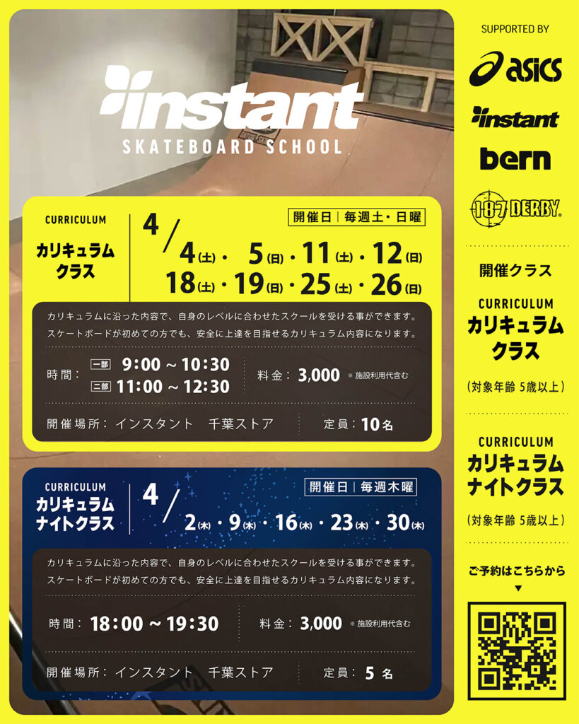 ▶千葉みなとスクールの詳細やご予約はこちらから→【ご予約専用ページ】https://instant-skateschool.jp/chiba/