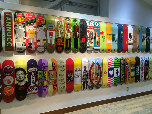 先々週の12月5日の金曜日の話になってしまうのですが、この日は仕事が休みだった為、Chocolateのブランド設立20周年記念のアニバーサリーエキシビジョンに行ってきました!会場にはアートディレクターのエヴァン・ヒーコックス(Evan Hecox)さんがいました!設立から20年の間にリリースされたさまざまなデッキやライダーたちの写真などなど、貴重な作品が沢山展示されておりました。展示されている作品の中には、SLIDER Vol.20のChocolate20周年特集で掲載されていたデッキや写真があって、楽しさ2倍でした!行くことができて本当に良かったと思っております。