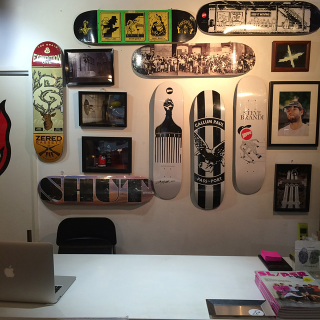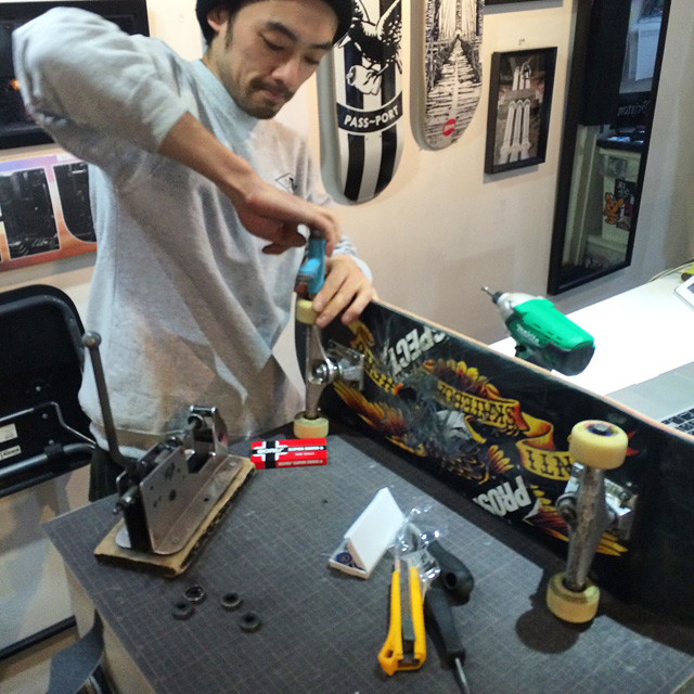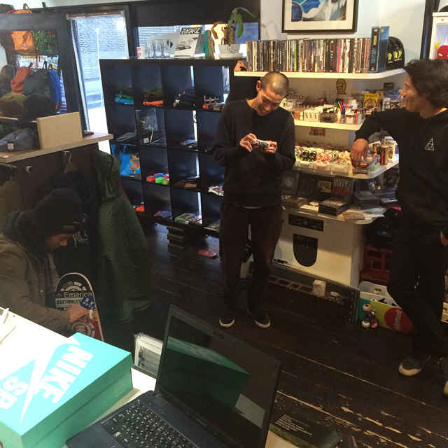 週末はサトル店長の出番です。天気のいい日は開店直後からパーツ交換やセッティング調整でこれから滑りにいく人が集まります。そこで会って「今日どこいくの?」って感じで一緒に滑りに行っちゃったり、シューティングの約束したりと、スケートショップっていうのはそういう役割があるのですよ。スケートを介してつながる人たちの交差点であります。そして流れが出来て何かが生まれる。