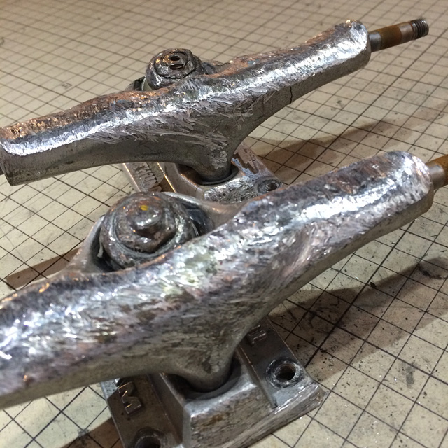 こちらは吉祥寺からいつか羽ばたくテンマの使い終わったトラックです。1月にしてすでにTHE BEST 大往生 OF THE YEAR。これかなりすっごいよ。まずは自分のトラックをよく見てください。Kグラインドが好きな人は前のトラックだけ斜めに削れているかと思います。ランプの50-50が好きな人は両トラックにコーピングの削れ方が確認できるはず。そうやって誰のトラックでもその人の好きなトリックやスケートスタイルがこのトラックの年輪に刻み込まれる訳なのですが、このテンマのトラックは全くそういう偏りがない。ただただ滑り続けて削り続けた感じですよ。「どこでもすべるなんでもやる」スタイルとでも言いましょうか、かなり好きな感じです。最終的にはハンガーにヒビが入って終了。もうトラック的にもここまで使えば本望でしょう。