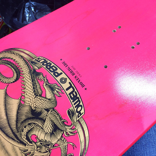 友人が持ち込んできたreissueのPOWELLは4穴でした。彼は全部乗っちゃうのでindependentのベース交換をお勧めしたのですが、キングピンの長さや乗り心地を考えて、今使っている足回りを組めるように、デッキに穴を開けて6穴仕様に。これ乗ってみたいわー。当時乗ってたのよ。このトニーさん。今見ると10インチもそんなに大きく感じないかな。welcomeとか復刻ラッシュで見慣れてきた。インスタントでは持ち込みデッキにご購入されたグリップテープを貼るのは大歓迎です。どんなデッキも乗れるようにセットアップ致します。ロングはダメよ。工賃はゼロですがグリップやパーツのご購入がない場合は工賃超高額に設定します。うふふ。