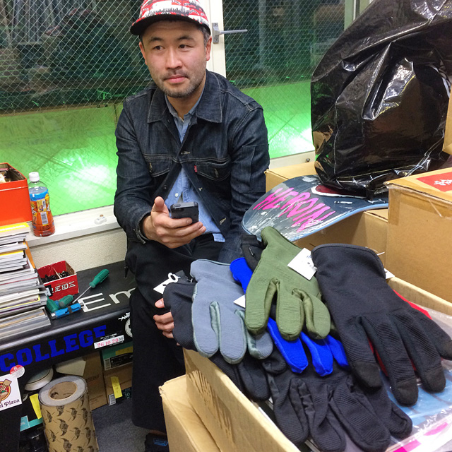 浦安ストアに大きな友達が来ました。世田谷ローカル仲間のアカチメン。STlineというグローブのブランドをディレクションしております。これがまたグッとくるヤツを作ってます。僕は手のひらが革製のSBってモデルが好きです。たぶん買っちゃいます。esowとのコラボモデルも今ならサイズ揃ってます!
