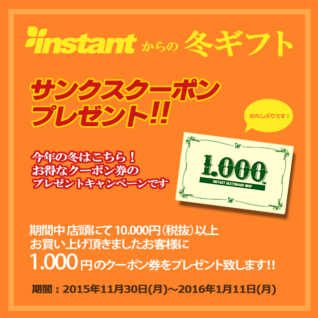 今年はインスタント20周年という事もあり、例年よりもちょっと長めにサンクスクーポンプレゼントキャンペーンを開催しちゃいます!期間は本日11月30日から来年2016年1月11日までです。ご存じの方が多いと思いますが、期間中に店頭で税抜10000円以上お買い上げのお客様に翌日から3ヶ月間有効の1000円オフクーポンをプレゼント致します。期間内はお得なクーポン付きでお買い物ができちゃいますので、この機会に自分の欲しかったアイテムをゲットしてはどうでしょうか!?