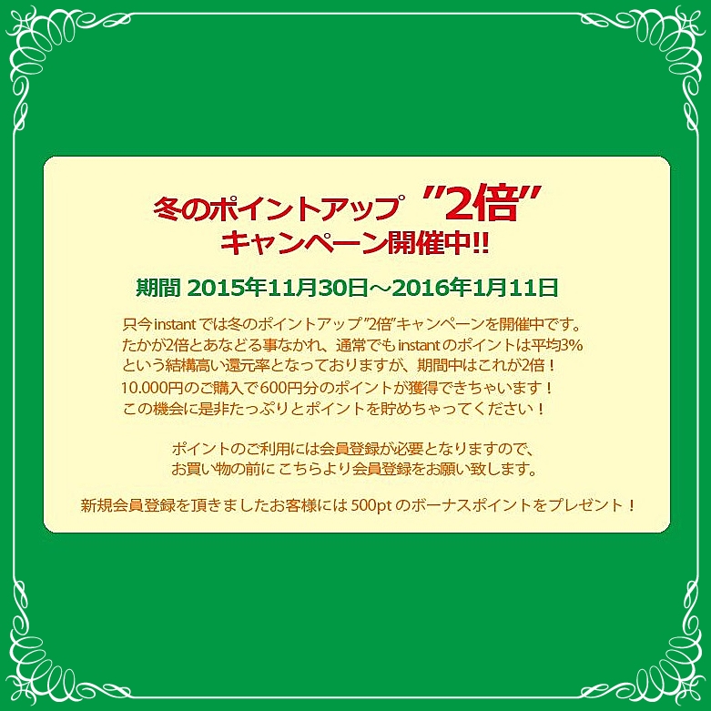 普段からインスタントのショッピングサイトをご利用のお客さまには、通販ポイントが2倍もらえちゃう冬のポイントアップ2倍キャンペーンを開催します!本日11月30日から来年2016年1月11日の期間のご注文で獲得できる通販ポイントが2倍になります!