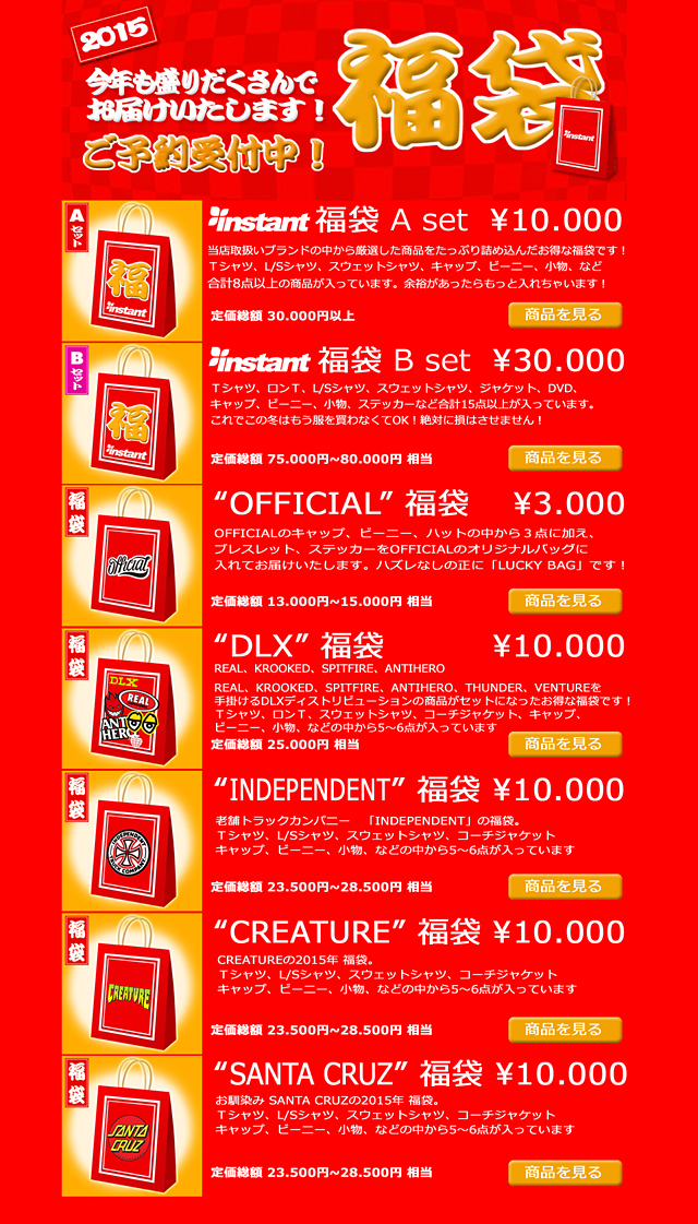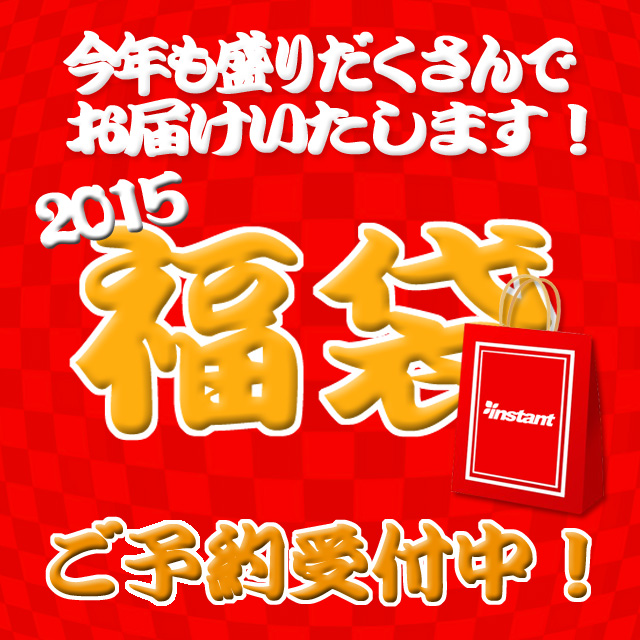 インスタントでは今年も「やりすぎ福袋2015」のご予約受付を開始します!また今年もガッツリと詰め込んで、みなさんのスケートライフを応援します。今年はなんと7種類の福袋をご用意できました。ご好評を頂いておりますインスタント「やりすぎ福袋2015」ですが、今年は壱萬円と参萬円の2種類です。1万円のAセットの内容はこちら。そう、上代3倍確定の内容。僕らの性格上、普通はこういうところに使う画像は一番膨らました感じの内容を撮るのでしょうが、こちらの画像はミニマムになります。わかります?そう、最低これだけは入ります、って意味ですので、当たりにはもっともっと内容が豪華になるのです。ポスターとかステッカーとかDVDとかの小物は作りながらポンポン入れちゃうし、アイテムも最低以上はかならず入ります。Tシャツやキャップが増えちゃうこともあります。それだけご理解ください。画像は「最高でこの内容」ってことじゃなくて「最低これだけは入ります」ってことね。そして3万円のBセット。内容はこちら。画像の意味は同じです。「最低これだけ入ります」とご理解ください。「なんだー3倍確定じゃないじゃんか」と思った方もいらっしゃるかもしれませんが、上限の80,000円を軽く超えちゃうのもあるんですよ。こちらのセットにはかならずジャケットが入るのですが、ジャケットって価格の幅が広くてね。なので僕らの性格上、遠慮がちに75,000円~80,000円ってことにしましたが、ここがミニマムだとお考えてください。今年もやりすぎるのだけはお約束しておきます。