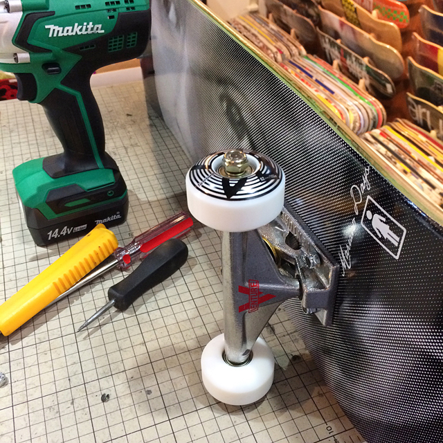トラックはTHUNDER147です。なんかわかるわ。ウィールはSPITFIREの52mmだったかな。いつもは51mmが多かったのですが、今回は「ちょっと大きくしてみました」って言ってました。ウィールのサイズはここ最近ちょっと小さ目になってるね。いや、スタイルや環境で色々か。55mmとかもやっぱり店頭には必要ですから。セッティングはお手本は色々あってもやっぱり自分の好みを探していく旅なのです。その時の好きなトリックとか滑る場所とかでも変わってくるし、気分や流行でも違ってきます。要は「調子いい」かどうか見極める自分の定規を作る事。その為には色々なサイズや組み合わせを試してみて、自分定規の精度を上げていくことが大切です。