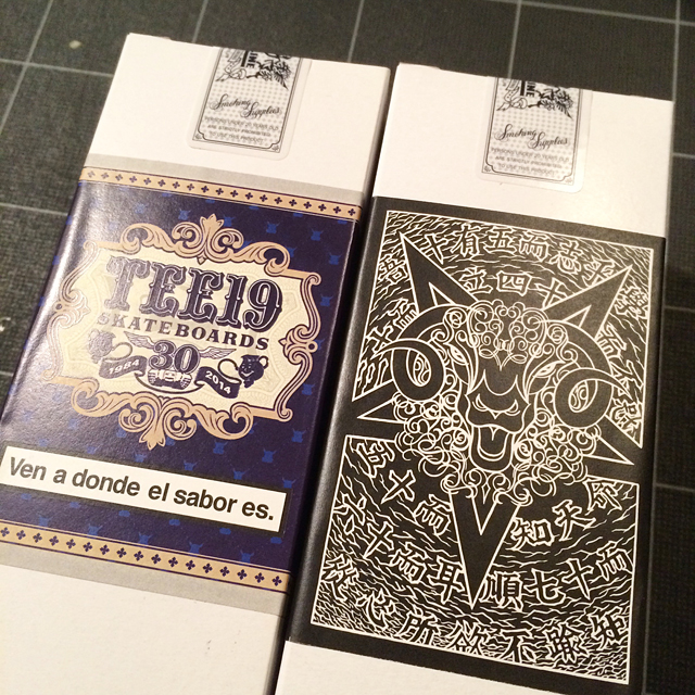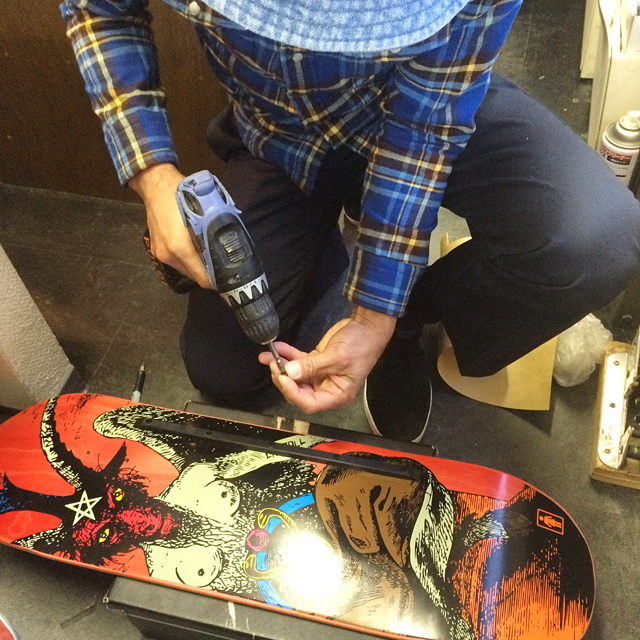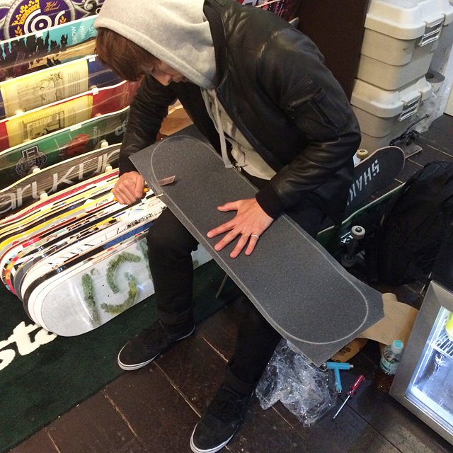 スケートショップでは常連はほとんど自分でデッキテープを貼ります。貼り方の好みがあったり、加工したり、色々な理由があるかと思いますが、やっぱり自分のデッキは自分で貼りたい、って思いが一番の理由でしょう。なんだかわかる。先日「ハウツースケートボウ道」でキレキレのインヒールを見せてくれたダイゾーくんもやっぱり自分で貼ってます。たぶん相当な数のデッキを貼ってますね。だって仕事の電話がかかってきても手を止めずに貼り続けて綺麗にピッチリ仕上げてました。さすがだ。