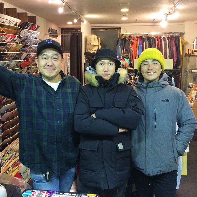 浦安ストアには韓国のシンがやってきました。朋友マサトモと一緒に。シンが日本に住んでいた時にマサトモのルームメイトだったそうで、もうかなりバディー化しております。先日のAJSA韓国の時に色々話せてシンのアツい部分を知りました。聞けばよあそび工務店韓国支部長らしく、ウッチーには千葉スケートボード協会韓国支部長を命ぜられてました。千葉じゃねえし。また韓国行きたいわあ。