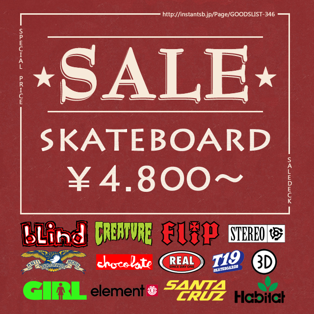 セールデッキが大増量! 今日は東京は雪です。吉祥寺はそんなに積もってないので明日には滑れそう。冬でもガンガン滑っている人はものすっごく上手くなります。やっぱりモチベーション高めで環境が揃わないとなかなか真冬スケーツは厳しいからね。 そんな人たちはデッキもシューズもボロボロです。インスタントではさらにセールデッキを増量してそんな皆さんを応援します。デッキだけじゃなくシューズやアパレルも増量してますので、セールページのアイテムは全部チェックしてみてくださいね!!