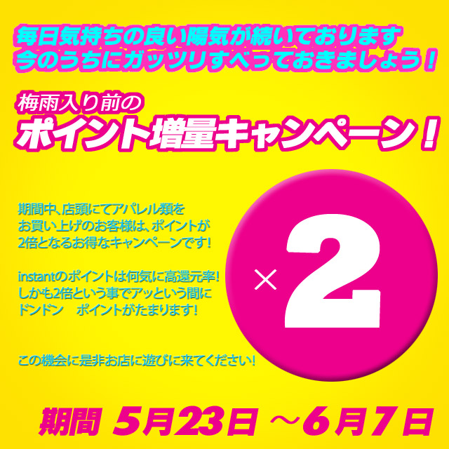 本日、5月23日(土)~6月7日(日)まで浦安、吉祥寺ストア、千葉ストアの店頭で期間限定アパレルの店頭ポイント2倍キャンペーンを行います!