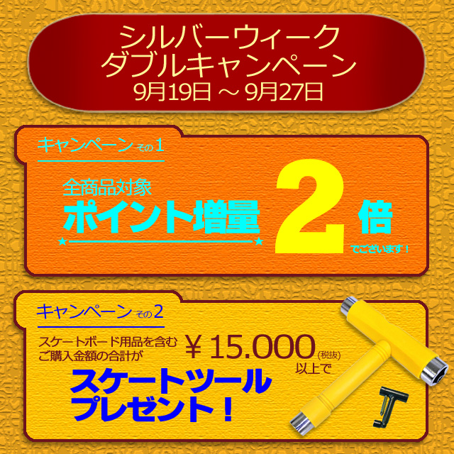 1つ目は『店頭ポイント2倍増量キャンペーン 』です!期間中にお買い物で、店頭ポイントが2倍貯まるかなりお得なキャンペーンです。秋になって涼しくなったから、デッキやトラックを新しくしてスケートするぞ!って方はもちろん、秋冬物の洋服が欲しかったんだよなーって方など、この機会にお得にお買いものしちゃってくださいね!遠方からお越しの方も、インスタントの店頭でお作りするポイントカードはなんと有効期限が5年もありますので、この連休中にお近くにお越しの際は、是非店頭にもお越しください!