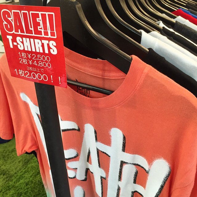 もうこう暑くなっちゃうとスケート時の着替えのtシャツは3枚は必要。いや、5枚か。ちょっと滑るとtシャツ絞れるからね。滑り続けているとtシャツからポタポタと汗が落ちる位になっちゃうので、しょうがなくそこで1枚。ジュース飲んでたらtシャツぴたぴたで気持ち悪くてまた1枚。ガッツリ滑って帰る前にもう1枚って感じすね。ライダー達は撮影でスポット移動とかあるから、移動の度にまた2枚、って感じでtシャツはいくつあっても困らない。ま、長い前振りですが、千葉ストアにはイカしたセールtシャツが沢山あります。webストアにも色々。おはやめにどうぞ。
