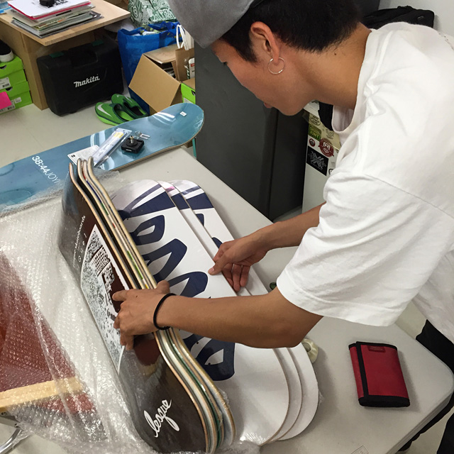 これがPASSPORTの最新モデル入荷日ね。もうみんな超楽しそうだったし。スケートボードのデッキって、やっぱり自分が乗りたいかどうかってすっごく大事なんですよね。スペックでも素材でもなく、グラフィックやブランドで表現する自分のアティテュード。Tシャツと同じでやっぱり何でもいいって訳じゃない。子供の頃に着ていたアンパンマンのTシャツは今着れないでしょ?サイズとかの問題じゃなくて、グラフィックが持つ意味やスタイルって自分が思っているより人に伝わると思ってます。僕は。