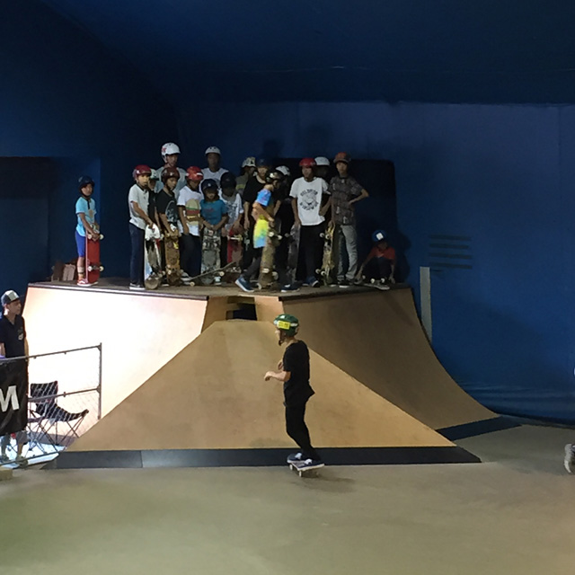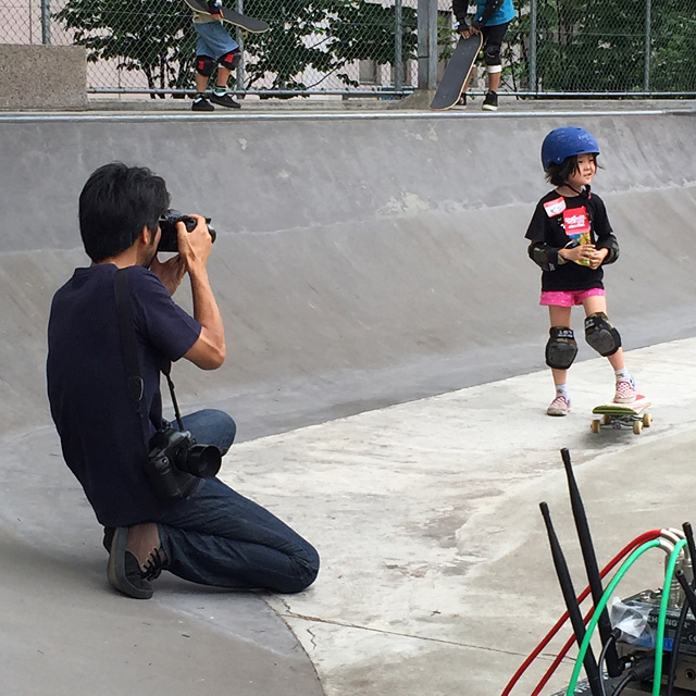 さあやるか、ってタイミングで雨がポツポツと。様子を見てまずはスクールからの開催です。スクールはファルコン主催だったみたいすね。先生陣が足りなくて、急遽現場に居た同士達が先生に。この辺のスケートボーダー達の連携っぷりがお見事です。愛がある。中野のシュン君とか一番先生っぽかったし。ハマちゃんのレクチャーをじっくり見てましたが、アドバイスがものすごく的確。試技もお見事。さすがです。