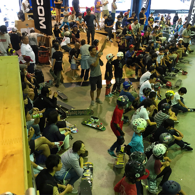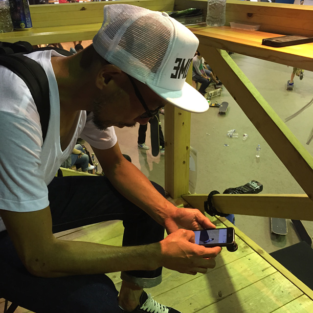 会場にはこのコンテストの為に作られたnewセクションが。これがまたゴッツイのよ。見ればわかるね。始めて見るセクションでは各ライダーの適応能力が試されます。ストリートで一番大事な部分です。だからね、練習見るのが楽しかったわ。1回テール蹴って2回目で全力ってヤツ多かったな。こういうコンテストの練習ってもうかなりカオスですから1回滑る重みが違う。次にいつ順番回ってくるかわからないからね。だからいかに早く現場に適応して自分のスキルを全開で出せるか、っていうのが必要な能力になるのです。デキるヤツなんかは隙間見て1?2回テールを蹴って、レールの滑り具合チェックしたらもう滑らないのよ。カオスに揉まれてケガしても馬鹿らしいしね。僕は本番で誰がどういうトリックを出すか練習でチェックしているのと同時に、そういうドラマというか流れを練習で見てます。