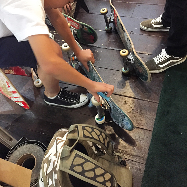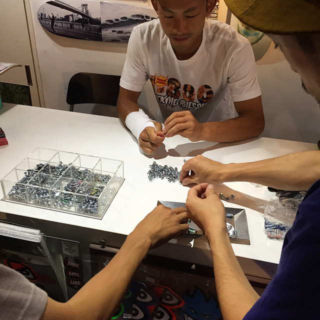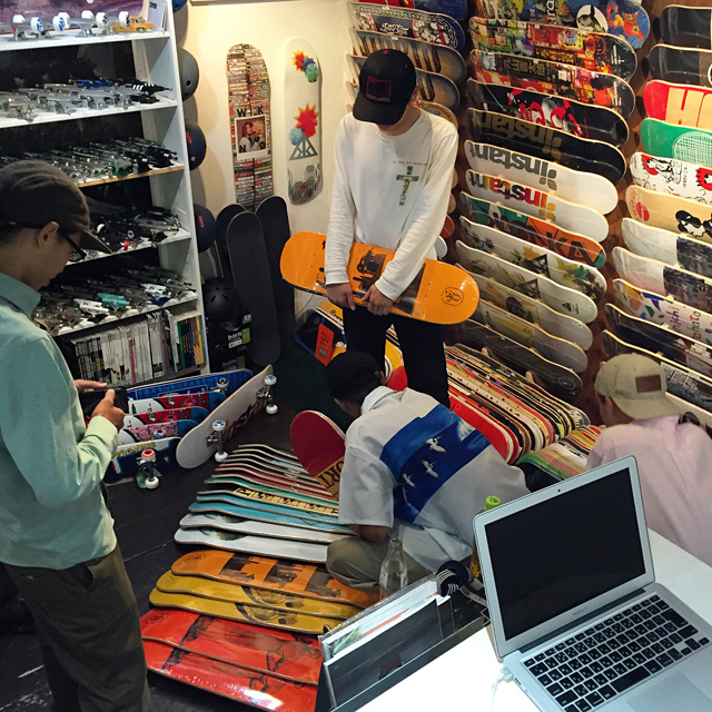 雨なんか降っちゃうともうみんなでベアリングの掃除し出したり、アクセルナットを交換したり、ショップでの細かい作業が続きます。ローカルや常連さんは工具は貸すので自分でやってねスタイル。これは面倒なんかじゃなくて愛なのです。だって街でなにかの原因でナット外れて、アクセルナットのネジ山が潰れて入らなかったら滑れないじゃん。ショップだったら色んな工具があるから速攻で直せますが、街で発生したらかなり面倒。なのでショップで作業している間に、僕はもし街で発生したら、まずはシャフト見て潰れた箇所を確認して、あーしてこーして、ってやり方を伝授します。ただ話しただけじゃ伝わらない。実際に目の前で作業しながらだからリアルに伝わるのね。そういうのもカルチャー伝承の一部ですよ。街のアクシデントは本当に予期せぬこといっぱい起こりますから。そういう経験がスケートライフを厚いものにしていきます。