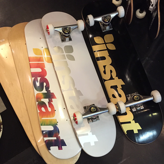 こちらは新しいインスタントのロゴデッキです。毎回ライダーや友人らがカラーなど決めているんですが、今回はかなりシンプルで男らしい感じになってます。個人的にチェックして頂きたいのはキッズデッキ。タイダイなグラフィックもイチオシですが、チェックしてもらいたいのはそのスペックです。このキッズデッキは長さは普通のキッズデッキですが、幅が7.625インチとキッズデッキの中ではやや幅が広くなってます。これは色々考えて、上達していくキッズのレベルに合わせて、安定感を増す事と同時に、トラックの選択肢を広げる意味もあるのです。現在は7.0インチとかのキッズデッキだと、装着できるトラックは限られます。7.25インチってキッズデッキで一番多いサイズでもトラックは選べる範囲が限られます。インスタントのキッズデッキだと、だいたいどのメーカーでもリリースしているサイズが装着できる。長さやホイールベースはキッズデッキのスペックですので、かなり安定感があるままクイックに乗れるようになるでしょう。一度お試し頂きたい。