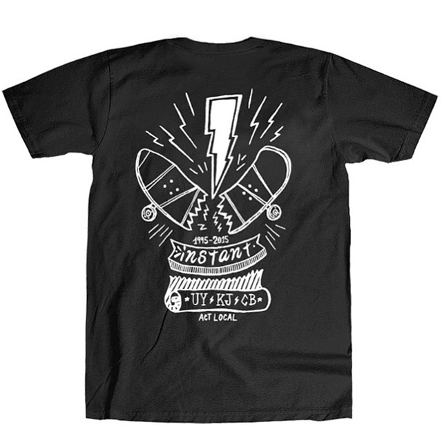インスタント創立20周年を記念して、吉祥寺ストアのローカルであり、裏原カルチャーの元祖カリスマでありますRyuji Kamiyama氏が記念Tシャツのデザインをしてくれました。これかなりグッとくる。書き下ろしの素敵なグラフィック。このデザインに書き込まれた「ACT LOCAL」ってキャプションにまた僕はグッときてしまうのです。スケートボードはやっぱりローカルがとても大事だと思ってます。最近はインターネットの進化によって、誰もが最新で最高の情報を得ていると信じています。その情報が本当に最新で最高なのかは誰もわかりませんが、その自分が信じた情報を疑わない人が多いのもまた事実です。インスタントがネットショップを始めたのは1996年です。当時は僕の友人でもパソコンを持っている人は少なかった。携帯も普及してなかったし、インターネットもまだまだ進化前の一部の人が利用するだけのものでした。なんでインターネットだったのか、は話すと長くなるのでやめますが、僕らはある志を持って始めました。その後、インターネットが普及して大規模なwebモールがいくつもでき、決済システムと物流の進化でどこに居ても商品を入手することが容易くなりました。地元にショップもなく、スケートパークもスポットもなくても最新のスケートギアがいつでもチェックできて購入できます。ではどこで滑るのですか?多くは自分の家の近くの便利なスポットで練習するでしょう。それがローカルです。自分が手の届く場所。目の届く場所。そこでプッシュやオーリーを覚え、仲間に出会い、ケガをしたりケンカをしたり、数々の自分越えの思い出が山盛り積み重ねられるのです。僕はすっかりオジさんですが、そういうローカルの思い出は今でもキラキラと輝いて思い出されます。僕はそういうローカルを大事にしたい。アメリカではSUPPORT YOUR LOCALと言われて何年も経ちます。どういう意味かはそれぞれの捉え方で変わってくると思いますが、ローカルの大切さは失って始めて気がつきます。そして自ら離れた場合でも、大人になってそこで過ごした時間がどれだけ貴重な時間だったかに気がつきます。いつかまた紙に残せるどこかの誌面でこの思いを伝えたいと思ってますが、僕はこの神山さんのデザインに、「ACT LOCAL」というメッセージに、なにかシンクロするものを感じてしまいました。本人には恥ずかしくて話していません。