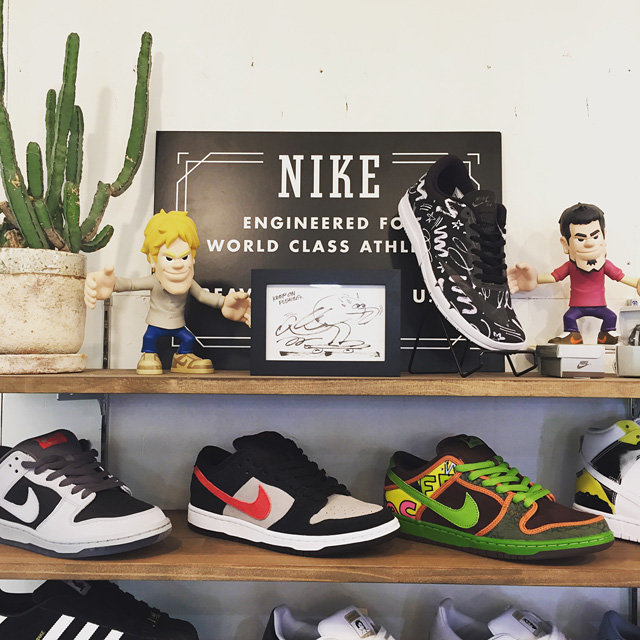 千葉ストアのディスプレイは色々じっくりと見ると面白いです。このNIKE SBのライダー二人が誰だかわかる?リースとジーノ。あのシューズboxの中にはE-QUEとか入ってますからね。先日ご来店頂きましたJARVIS師の書き下ろしポストカードも額装して鎮座しております。他にも色々あるのでぜひチェックしてみてもらいたい。