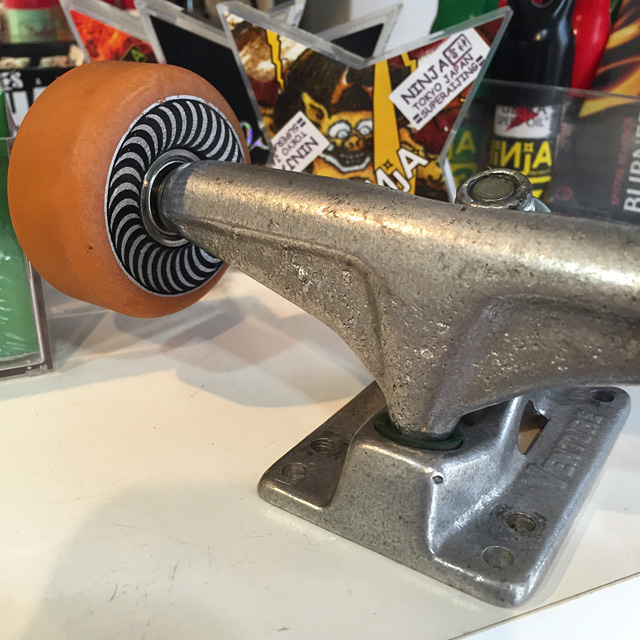吉祥寺ローカルの花木くんが持って来たこの足回りがよく見たらかなり青春でした。これVENTUREトラックの4こ前くらいかな?今のDLXになる前のVの前のAWAKEの前の6穴ですかね?現在はトラック3大メーカーのひとつではありますが、この頃はまだVENTUREって言うとマイナーな感じしたものです。装着されているSPITFIREも当時もの。僕は一番初めのSPITFIRE使ってましたが、デザイン的にはこれと同じ。これはNEW SCHOOL時代に入って細身になったモデルです。すっかり飴色にはなってますが、これまだ使えるね。6穴だったらデッドストックのデッキにも装着できるじゃん。吉祥寺ストアに飾っているので気になる人はチェックしてみてください。