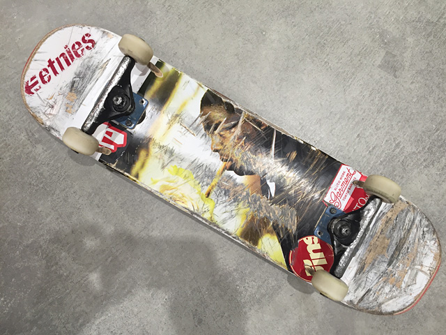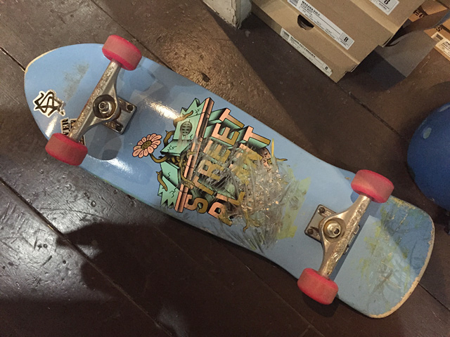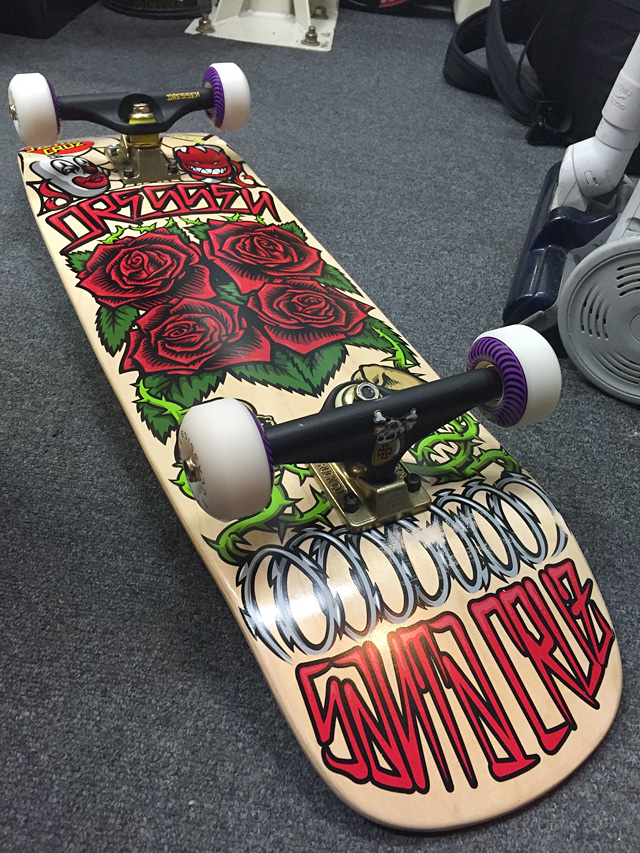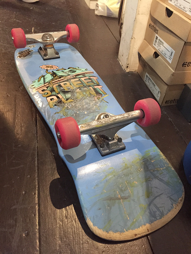 そしてこちらがバレリー先輩のセッティングであります。デッキはもちろんSTREETPLANT。これかなりガッツリしとる。80年代の香りが。サイズは9インチ。なんだか小さく見えますね。バレリー先輩は何度か会ったことありますが、もう20年以上前のことで、どちらかというとヒョロヒョロでセンシティブな青年のイメージ。雑誌やビデオでみるみる内にpowellを辞め、旅に出たりプロレスラーに転向したり、コンテストでガンガン攻めてたり、ブランド作ったり、ともうガンガン前進を続ける姿を見ていて、再会する前のイメージとしては門仲のせいやくんより20cmくらい大きいイメージでありました。でも会ってみたらあの時に千葉の街をプッシュして回ったバレリーそのままでありました。
