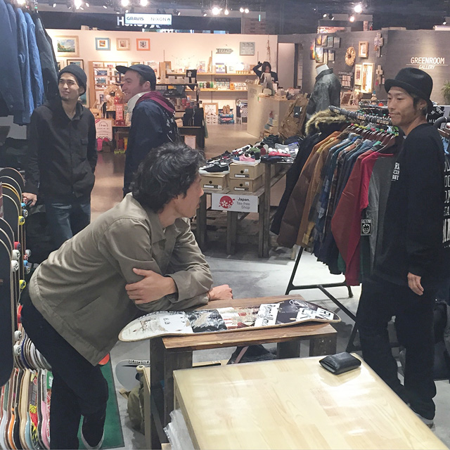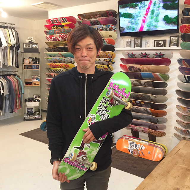 千葉ストアにはマサオが来ました。何年ぶりだろうか。やっぱり僕らの世代に千葉のローカルで先端を走っていたスケートボーダーなのです。今と違って僕らが超滑っていた時代にはスマホも携帯もありませんでした。毎月リリースされる雑誌の情報だけでは満足行かず、やっぱり動き回って色々なスポットのローカル達とネットワークを作っていくのです。そこで伝わる最新情報。ある時はセッティングやパーツのことだったり、イベント情報だったり、ライダー移籍の情報だったり。違うローカルに行けば違う価値観や情報があります。そうやって日本中のスケートボーダーがある一線を越えると一気に繋がっていく時代でありました。マサオもそのひとりです。普通に新しいセッティングで組んでました。滑ってるのね。さすが。