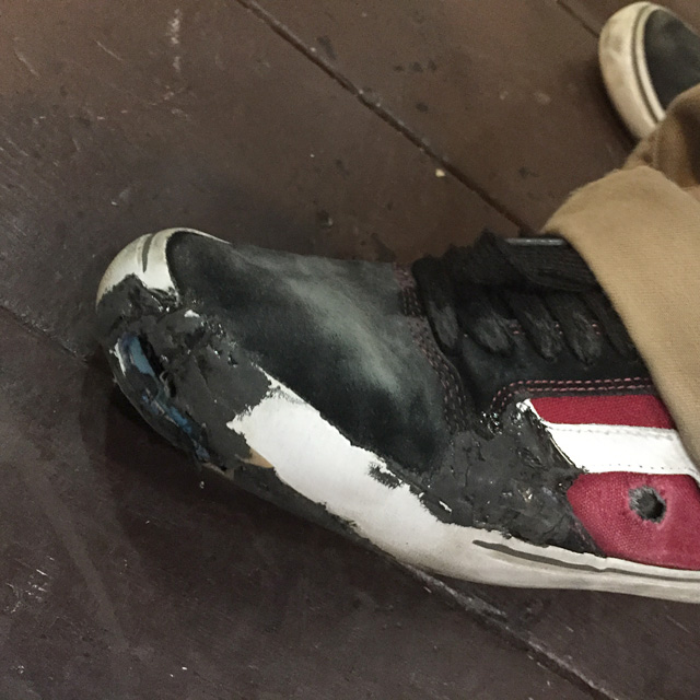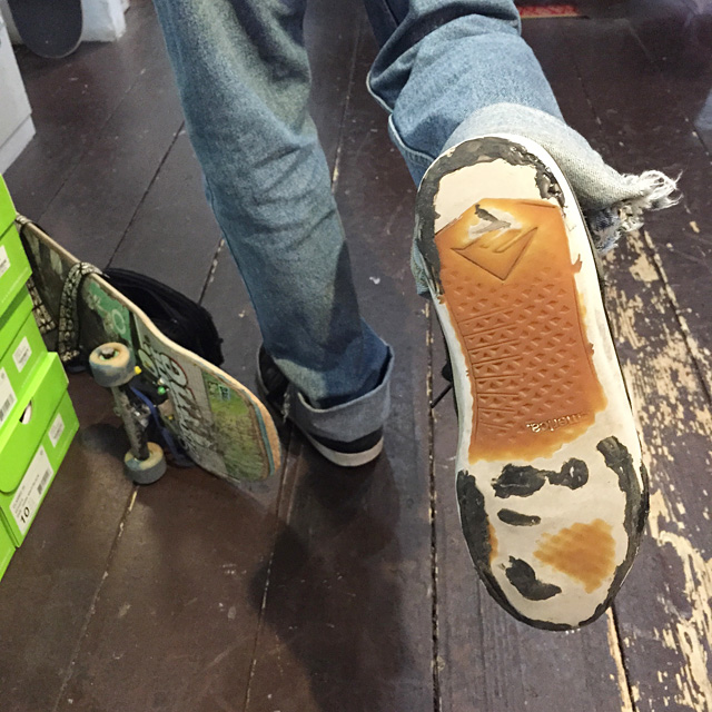 こちらにもまたシューグー職人。EMERICAをシューグーしながら6ヶ月間、バリスケモードで使いました。すごいね。僕は20年スケボー屋に立っていて、やってくるスケートボーダーによく聞くことがあります。「どこで滑ってるの?」、「デッキは何乗っているの?」、そして「デッキやシューズはどれくらい使える?」ってこと。ヤングガンズは大体デッキもシューズも1ヶ月。デッキの場合は月に2本ペースのヤツも多い。滑ってるね。そうなるとやっぱり燃費が悪くなってくるので、デッキもシューズもそれぞれの延命方法を追求します。僕の場合は足のサイズが同じのグーフィーのヤツを真剣に探しました。そうやってみんな上手くなります。そうやってみんな積み重ねます。どんなスタイルであれどスケートボードには間違いない。