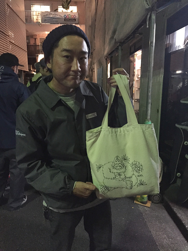 やっとバレリー先輩のことを。先日はバレリーさん、bigfootさん来店で吉祥寺ストアに沢山の方が集まってくれました。すごく急なご案内にも関わらず、気心知れたメンツで楽しい時間を過ごすことができました。こちらは日本のスイッチスタンスのパイオニア・ゆっくんこと新野豊であります。バッグにがっつりbigfootが書いてくれました。これいいなあ。