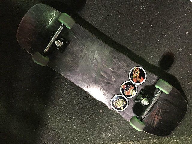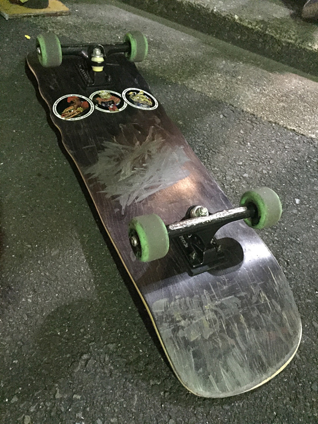 デッキ見て。これハンパないすよね。これすべてスラ先輩のハンドシェイプであります。indy109にthree wheel 78A、BONES CERAMICってもう完全に隙なしじゃないすか。スラローム全日本チャンプの経歴もある先輩ですから、もう僕の拝見なんてなんの参考にもなりません。逆に僕はここから色々なことを学ばせてもらうのです。カントの感じなんかはクイっと切れ込むセッティングだし、ブッシュなんて僕の想像を超えるトライ&エラーが繰り返されて落ち着いたセッティングなのでしょう。路面や気温なんかでも微妙にセッティング変わるそうですから、もう選手レベルのセッティングにはこだわりとかマニアという以上のなにかがある。感覚というかノリというか気分というか、なんだかなんでも良さそうですがなんでも良くない何かがあるのです。そういうことを僕は先輩からいっぱい教えてもらいました。