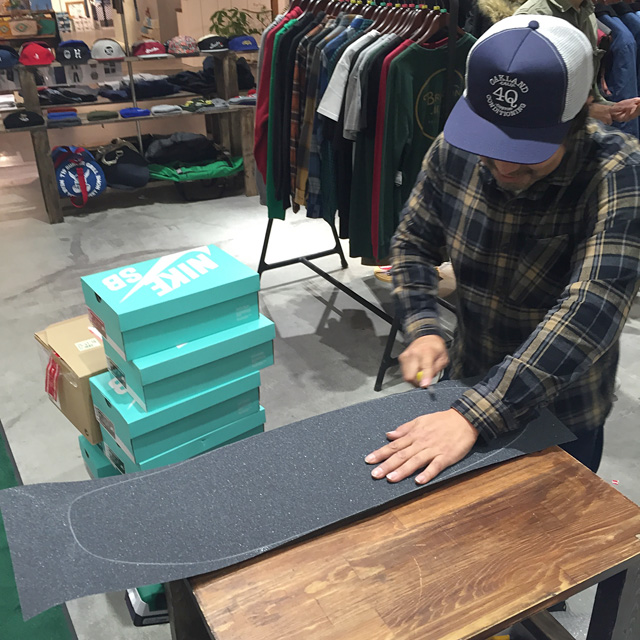 神長がデッキテープ貼ってる。この光景25年ぶりくらいかね?なんだか昔を思い出しました。毎日のようにスケボー屋に行って街をプラプラしてました。その頃の友人がやっぱり今も一番クロスする感じです。