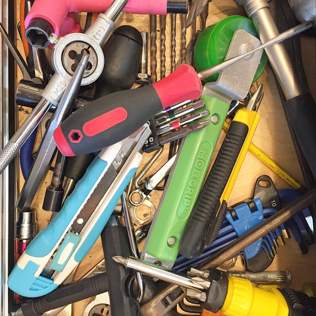 千葉ストアの工具箱の中です。なんでかすっごい安心するのよ。スケートボードのパーツはすべてインチサイズになるので日本のミリ単位の工具は微妙に使えない。千葉はインチでかなり色々な工具が揃っているのでどんなスケートボードが来たって絶対に修理できるぜ。あ、平沼工房のキングピン抜き差しくんがないか。あれあるとかなり楽なんだよね。