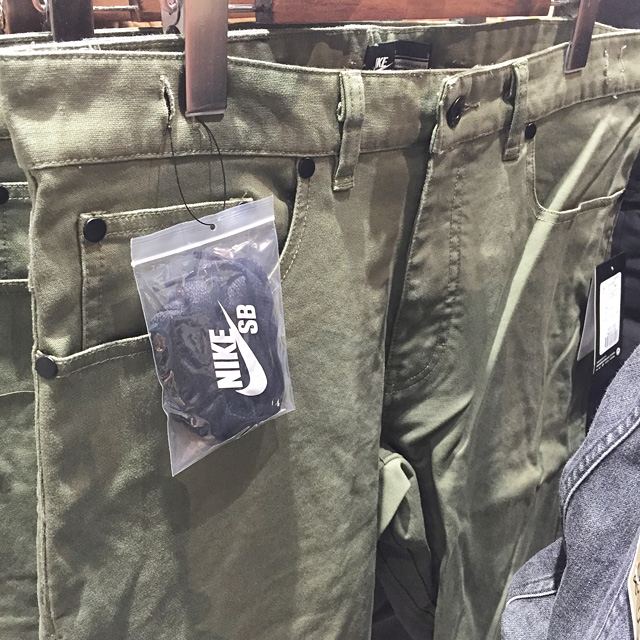 ナイキのパンツが届きました。「あれ、シューレースおまけなの?」って思ったらなんだかちょっと長いのね。よく見たらベルトホールに謎の穴。これはシューレースをベルト代わりに使っている人がよりスマートに着こなせるように、ベルトループが装備されたスケートパンツなのであります。こういうギミックはスケボーならでは。素敵です。