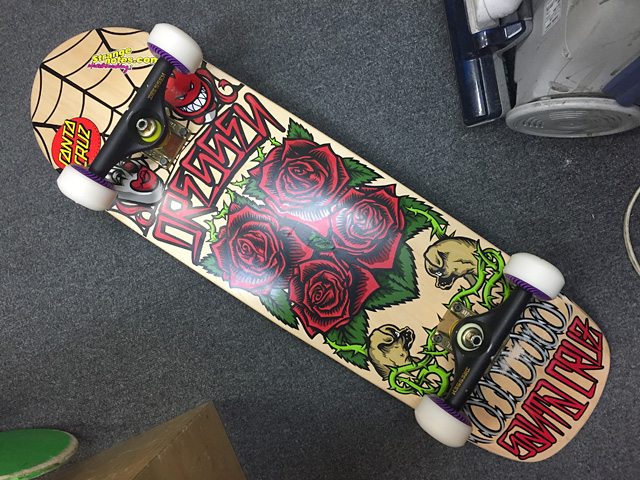 そして珍しく夜遅くに来店した門仲のジャイアントせいやくんのセッティングがお見事でした。こちらはサンタクルーズのドレッセン。これ僕も欲しかったんだよねー。なんか滑るならこれで、ってくらい考えてました。でもせいやくんのセッティングをチェックさせてもらって、じっくりみて自分のセッティングをイメージしたいと思ってます。サイズは8.75インチなんですが、すっごくピチッとセッティングが出ているのもあってもっさりしている感じゼロ。たぶんちょっとホイールベースは短めかもしれない。シェイプといいサイズといいグラフィックといい、なんだかこれすっごく乗りたいデッキすね。せいちゃんのデッキに合わせてパーツ全部決めてコンプリートしちゃうのすっごくいいね。やっぱりセッティングって毎回毎回自分の感触に合わせてすべてのパーツがすぐに変えられるようになるべきだ。まずは自分の仲の定規を作ることから始めましょう。