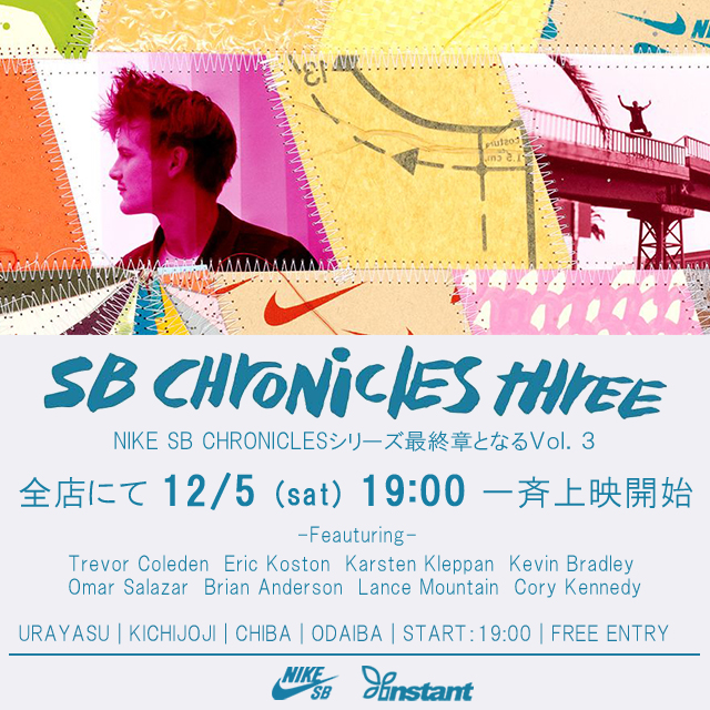 「NIKE SB CHRONICL3」12月5日(土)19:00~店内上映します! NIKE SB CHRONICLEシリーズ最終章となる「SB CHRONICL3」をINSTANT全店で一斉上映致します!!全店19:00より上映開始。入場はフリーとなっていますので是非遊びにいらしてください。2015年を締めくくるビッグタイトル。歴史的瞬間を誰よりも早く。 タイトル:NIKE SB / SB CHRONICLES 3 スタート:19時00分~ 入場:無料 場所:INSTANT全店 (浦安、吉祥寺、千葉、台場)