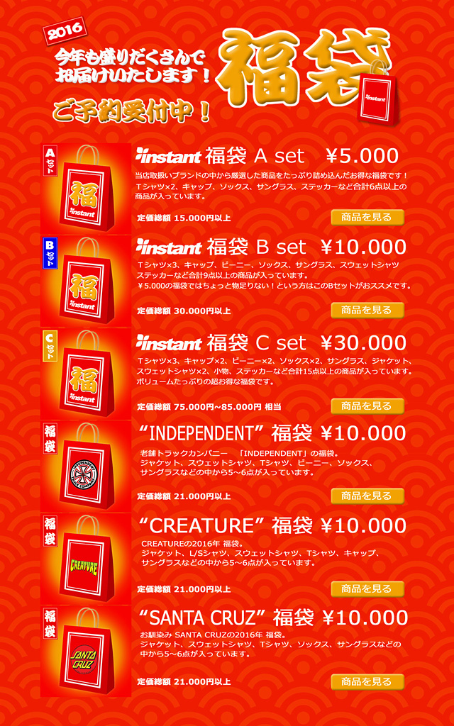 本日より店頭、ショッピングページで福袋のご予約受付を開始致します!2016年の福袋は前回無かった5000円の福袋【instant 2016年福袋 Aset】もございます!5000円でTシャツが2枚、キャップ、サングラス、ソックスが入ってかなりお得な内容となっております。10000円の福袋【instant 2016年福袋 Bset】も30000円の福袋【instant 2016年福袋 Cset】は前回よりも入っているブランドが増え、ブランドバリエーション、アイテムバリエーション共にパワーアップしております!!また、ファンの多いINDEPENDENT、CREATURE、SANTA CRUZの福袋もございますので、インスタントやりすぎ福袋と合わせてどうぞ。