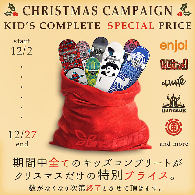 早いもので今年もそろそろクリスマスであります。この冬、インスタントのキッズコンプリートセットは大盛況であります。本当に沢山のキッズがスケートボードをプレゼントでもらって、またひとりスケートボーダーが増えるのであります。WEBストアではクリスマス少し過ぎてもうっかり者のサンタクロースが間に合うように、プレゼントキャンペーンは12月27日まで続けます。もう一回いいます。「クリスマスプレゼントにはスケートボードを」。もう一言いわせてもらうと、「ちゃんとしたスケートボードを」って感じ。やっぱりおもちゃ屋さんのスケートボードと専門店のスケートボードは全然違うものなんです。