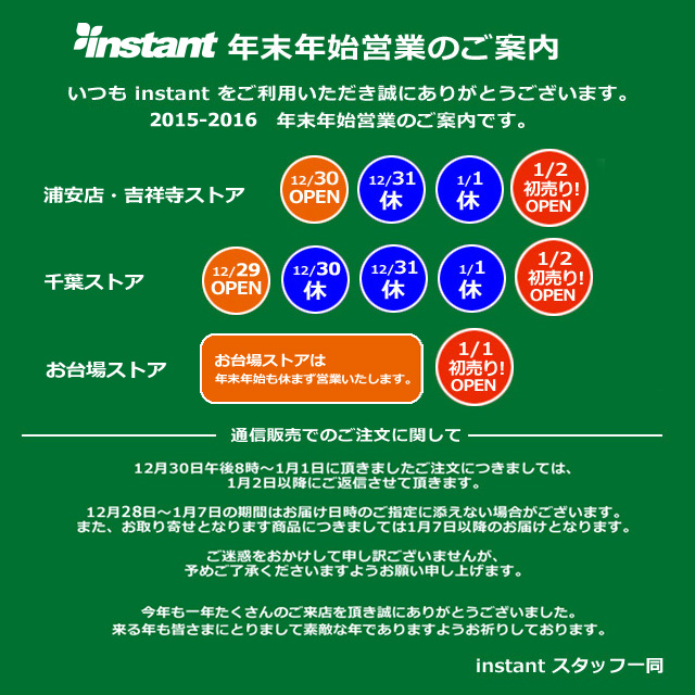 今年はインスタント20周年で色んな出来事がありました。まだまだ今年の残り数日も僕らはバタバタとやること山盛りで突き進んでおりますので、ちょっとまだ総括するには早すぎる。各店のスケジュールは画像をチェックして頂ければご確認いただけるかと思います。今年の秋に仲間入りしたインスタントお台場ストアでは、大晦日、元旦も通常営業で皆さんのお越しをお待ちしております。もちろんお正月にはグッとくる何かをご用意しておきますので、お台場にお越しの際にはぜひインスタントへ。千葉ストアは29日まで、浦安・吉祥寺ストアは30日までの営業となります。新年は2日からの幕開けです。新しい新年のスタートには、まず1「デッキを新調する」、そして2「ベアリングの掃除をする」、そして3「ウィールを新調する」、そして4「目的もなくプッシュで出かける」、さらに5「友達にスケートボードを勧める」、って段取りでお願いします。毎年お正月はお年玉でデッキを新調する学生が山盛りご来店致します。それにガッチリお応えできるように、いまからガッチリ仕込んでおきます。たぶんみんな驚きます。WEBストアでも色々とご用意しておきますのでお楽しみに。