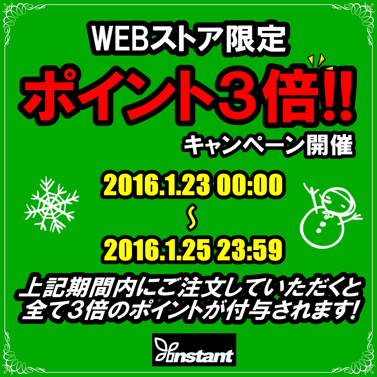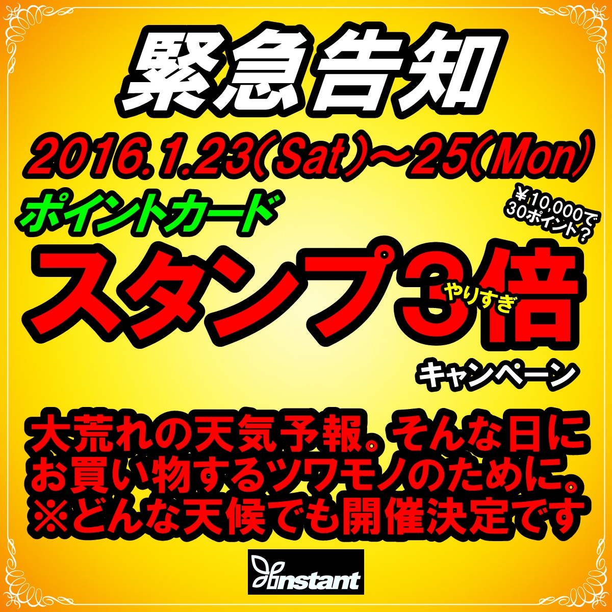 通常¥1,000お買い上げごとに1ポイントですが1/23~1/25の期間中にお買い物をしていただくと、なんと3倍!¥1,000で3ポイントゲットできます!ってことは¥10,000買ったら、、、え?30?ポイント????アリエナーイ。