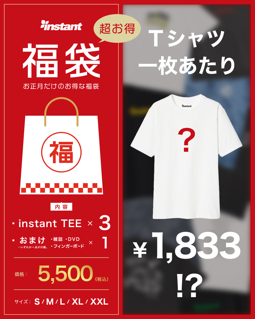 INSTANT TEE×3枚に加え、小物(雑誌・DVD・指スケのいずれか1点)が入った福袋。
