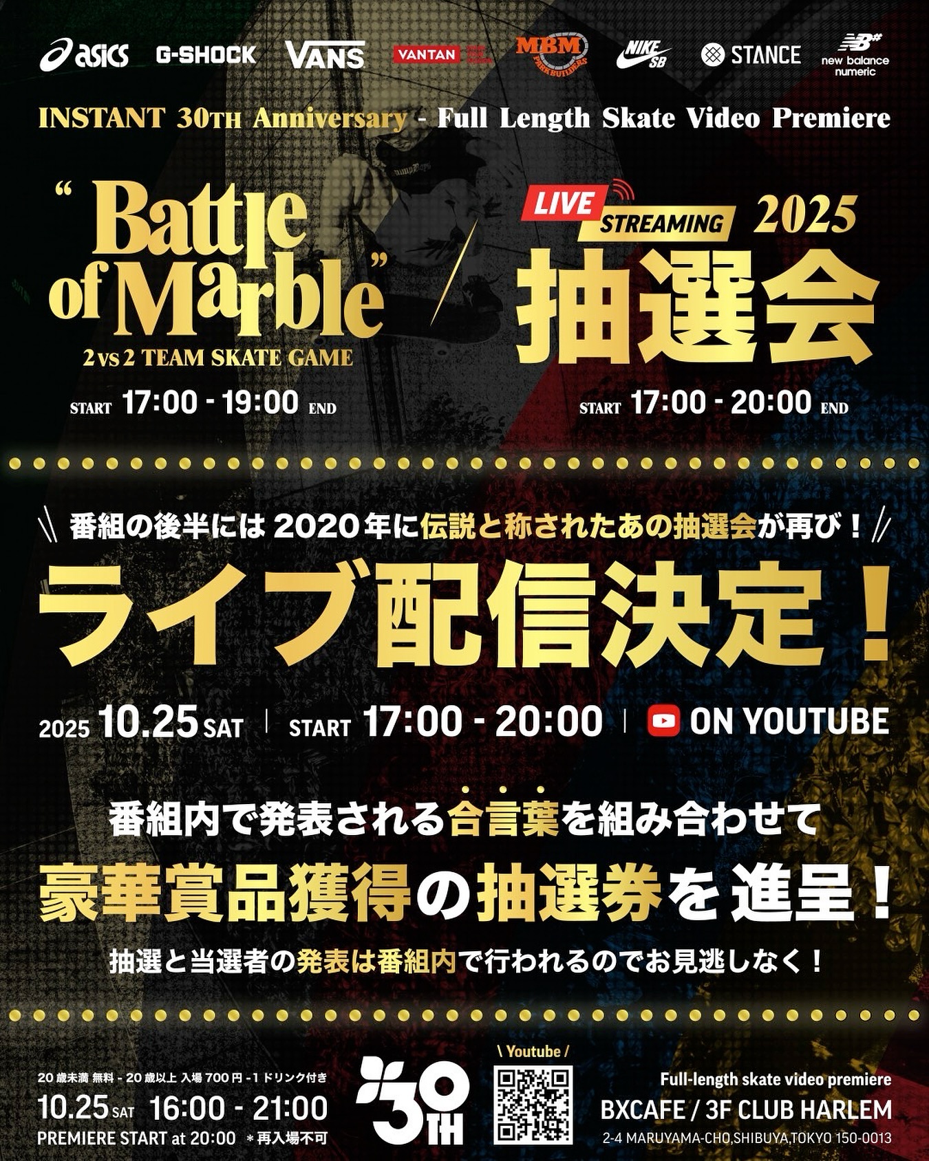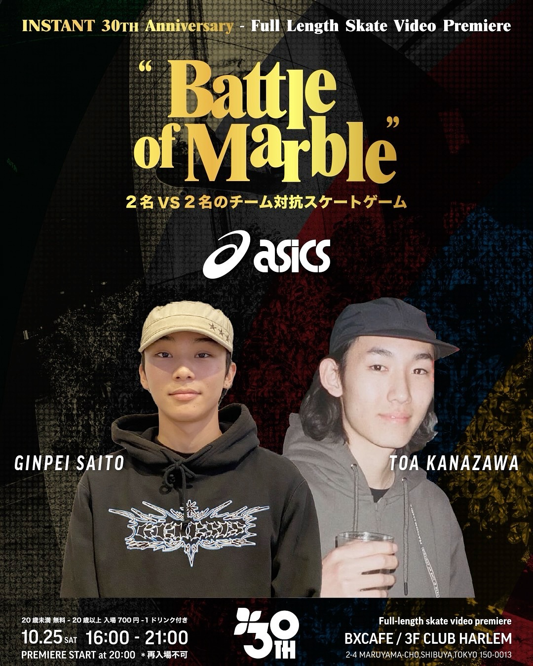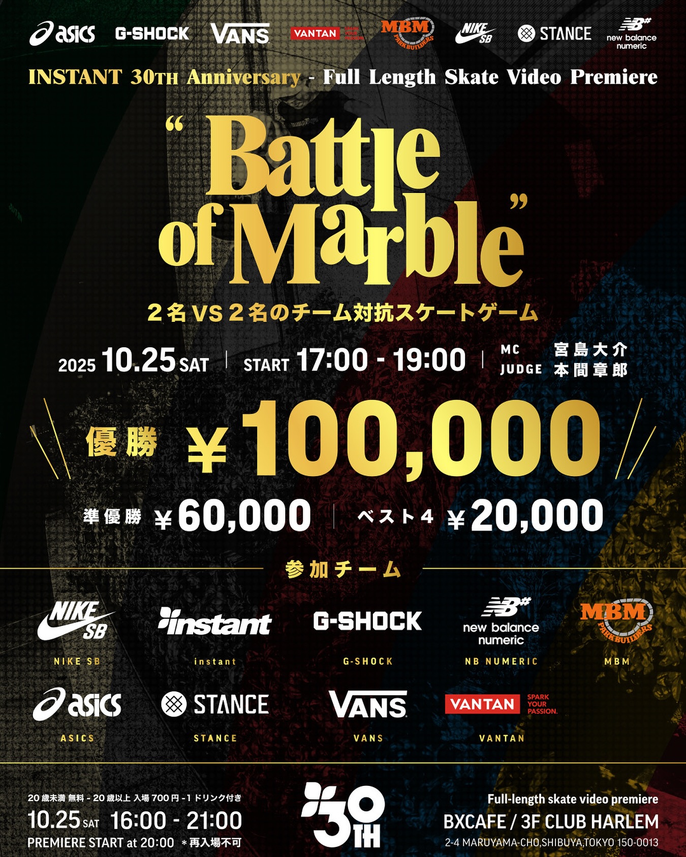 INSTANT 30th AnniversarySKATE GAME(Battle of Marble)各ブランド代表ライダーによる2on2チーム戦スケートゲーム「Battle of Marble」。優勝賞金10万円をかけた真剣勝負。参加チーム:ASICS / STANCE / VANS / G-SHOCK / NIKE SB / VANTAN / NB NUMERIC / MBM / INSTANTライダー情報は別途発表予定。日時:2025年10月25日(土)17:00〜19:00MC:宮島大介Judge:本間章郎(INSTANT)会場:BXCAFE / CLUB HARLEM 3F(渋谷)入場料:20歳未満 無料 / 20歳以上 700円(1ドリンク付き)※再入場はできません。入場時に顔写真付き身分証明書による年齢確認を行います。 #instantXXX #MARBLE